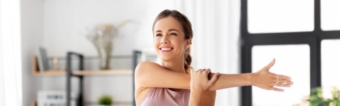 - Estiramiento lateral de pie: Con los pies firmes en el suelo, eleva los brazos y estírate hacia un lado, sintiendo cómo se alarga el costado del cuerpo. Cambia de lado lentamente.
